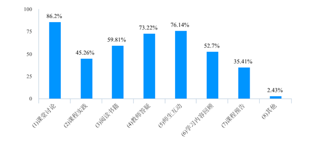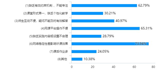 (1)学生对于线上课程学习遇到的困难及影响因素,通过问卷调查显示,最突出的问题来源于网络的稳定性差,其次是网络平台操作不方便,再次就是缺乏有效的约束机制、不能专注听课学习,还有师生互动不方便等原因。