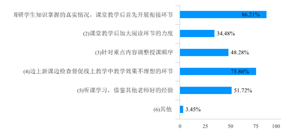 教师根据学生知识掌握的情况,做好线上教学转课堂教学的预案。多渠道多方面做好准备工作。课堂教学后首课开展课程衔接环节,加大阅读环节的力度,课堂教学后边上课边督促检查线上教学中教学效果不理想的环节,从而提出弥补措施,继续听课学习,借鉴其他老师好的经验。总之,未雨绸缪,为线上教学转课堂教学做好一切准备。
