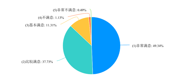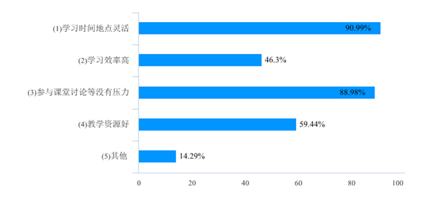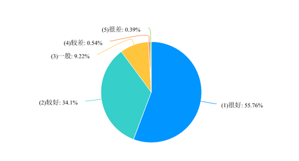 再次,学生对于线上教学环节、课程设计及教学资源比较满意。教学资料的获得比较快捷和全面,老师基本都会在课前提供教学大纲、授课PPT、电子版参考教材及资料、相关的音频视频资料等,便于学生及时查阅。相较于传统的课堂教学,学生认为线上教学具有时间地点灵活、参与课堂讨论无压力、教学资源丰富等优点。对于课程整体的满意度来看,非常满意49.34%,比较满意37.73%,基本满意11.31%。