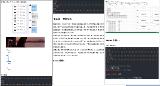 第四组拍摄人物的半身照,由付彦颖同学主讲,通过对人物半身照进行拍摄,并对取得的样本进行筛选分析,从构图、视角、光线三个因素构造线性回归模型,对拍摄照片进行评分。通过不同的软件Excel和Matlab软件分别对收集的数据进行分析,得到不同的线性回归模型,并进行了对比分析,最后利用新的人物半身照进行了模型检验。