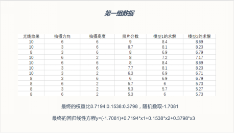 每个小组对收集的数据进行整理,并运用数学建模思想,将照片拟合成一个打分公式,实现将一张照片的参数导入便可由公式打出一个照片的分数。从而判别出最佳拍摄方法。