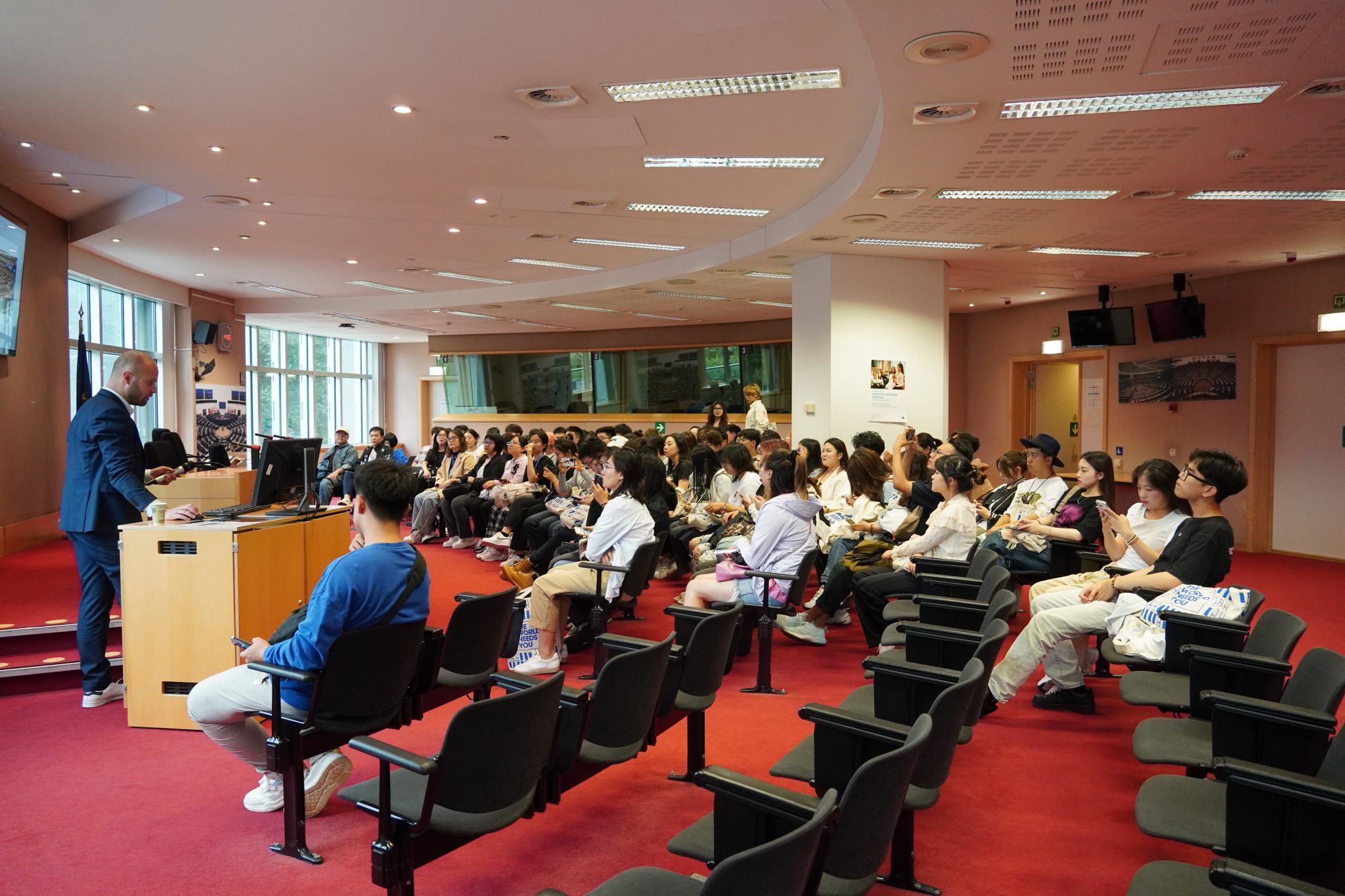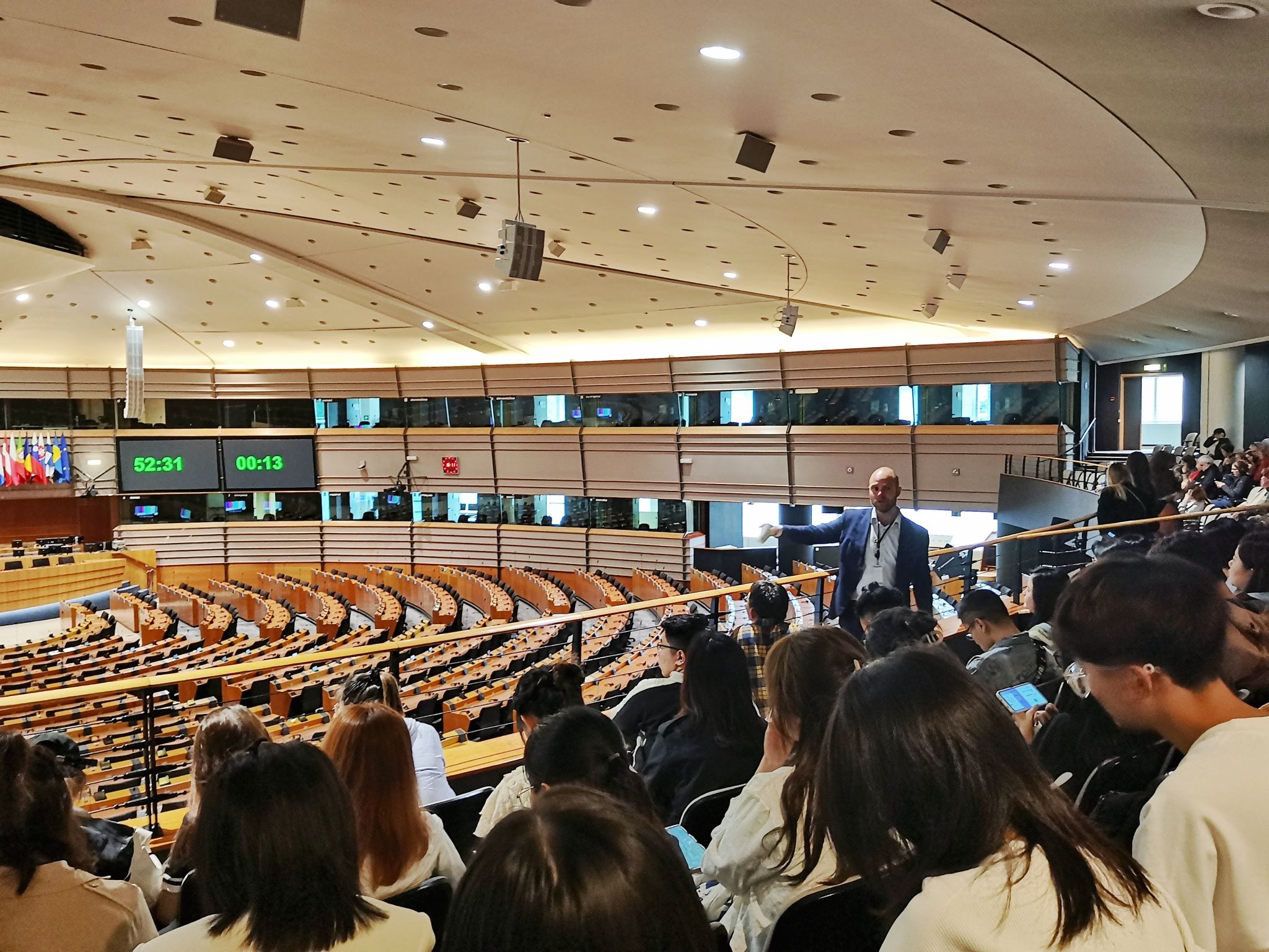 正式走入议会大厅,大家切身感受欧盟各国代表在协商、沟通、投票过程中的紧张情绪和决策魅力,并在相关区域进行参观记录。结束了一天的学习参观,我们对前往荷兰的研学之旅也充满了无限期待。