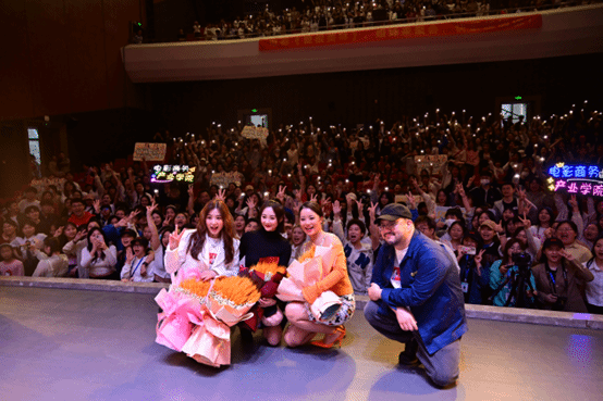 观影结束后,主创团队依次入场,在嘉宾和主持人的互动中,在场的观众知道了导演将电视剧搬上大银幕的原因,同时演员们也分享了电影《爱很美味》拍摄过程中的诸多趣事。映后交流过程中,电影商务产业学院预埋的“导演对话”、“爱要大声说出来”、“姐妹聚会,唱跳必备”三个环节也成功推进,现场气氛十分热烈,欢呼不断。