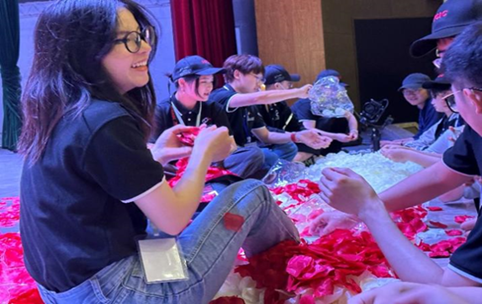 4月2日路演当天,电影商务产业学院精英班的学员们一早便来到缤果大剧院进行前期准备工作,整个大剧院都是精英班学子穿黑色制服、带红标团帽、胸前挂着工牌的小小身影。为确保活动顺利进行,有的学员忙于现场物料布置,有的学员忙于设备测试,有的学员忙于现场秩序维护……每一位学员都严阵以待,打起十二万分精神投入到此次路演活动实践中。