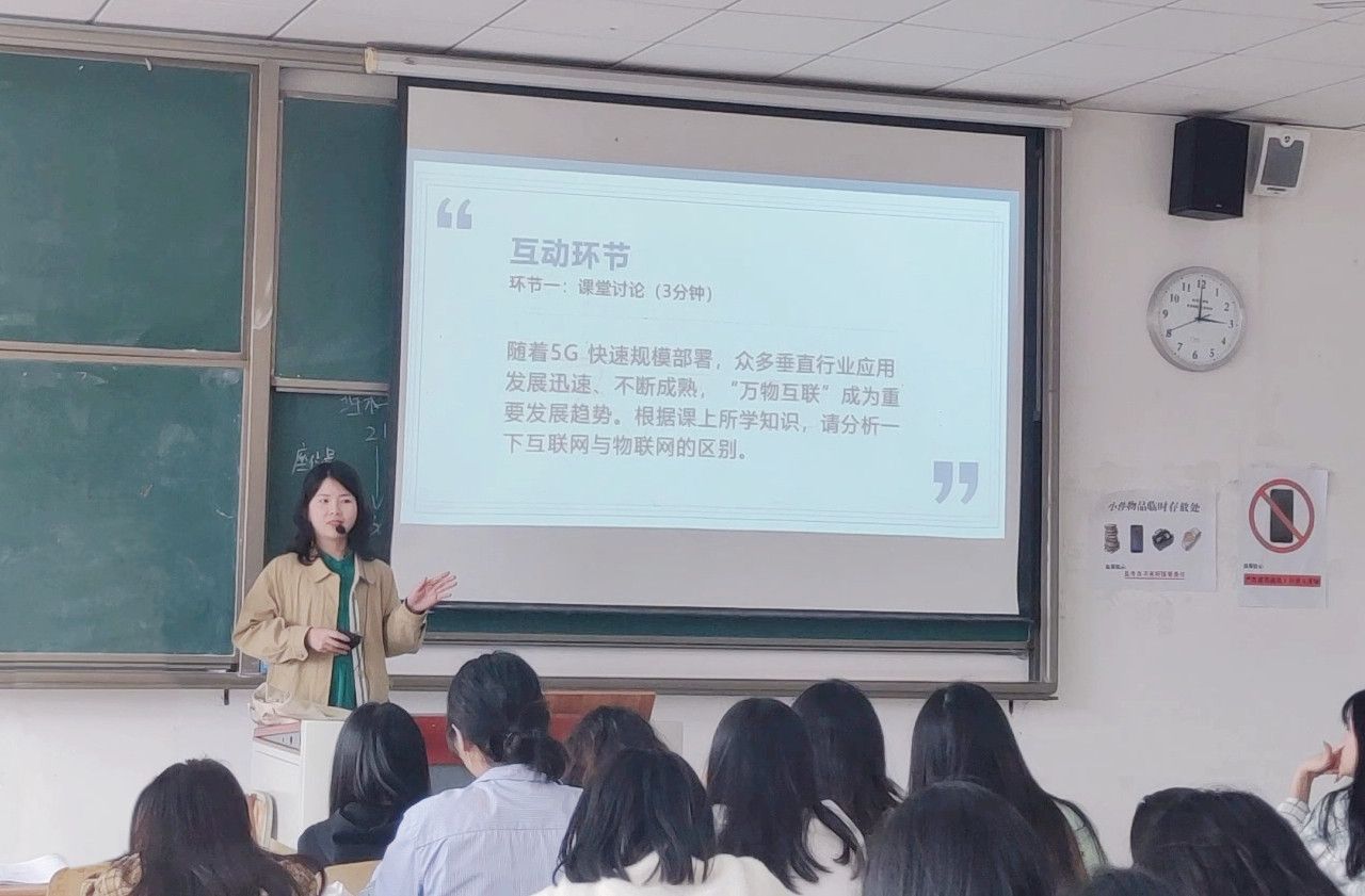 接下来,课堂交给了通信与信息工程学院专业基础教研室的吴萍老师,她通过杜牧在《过华清宫绝句》中“一骑红尘妃子笑,无人知是荔枝来”的诗句将同学们带到古人运送荔枝的场景中,又对比了现代运输产业的迅猛发展,让同学们清晰地感受到物联网技术给生活带来的巨变。然后,吴老师结合生活中常见的“共享单车”、“手机支付”等应用,向同学们生动讲解了“什么是物联网”、“物联网的关键技术有哪些”以及“物联网在生活中的应用分类”。最后,她还与同学们讨论了当今物联网热点技术,比如5G技术、AI技术等,物联网技术的发展目前还远没有完结,这一技术的应用前景依然巨大。