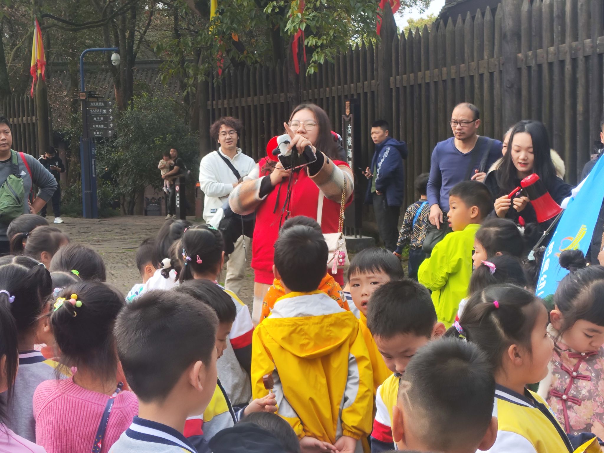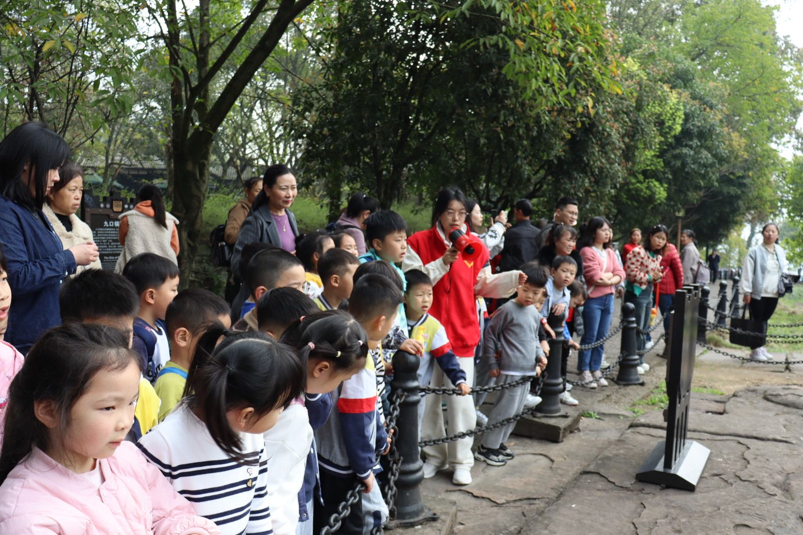 抵达游客中心后,在老师和四位同学的带领下,小朋友们来到了游览的第一站:军营校场,并在瞭望塔下进行合照。初踏钓鱼城遗址,小朋友们对周围的古建筑充满了浓厚的兴趣,本次活动由此拉开序幕。