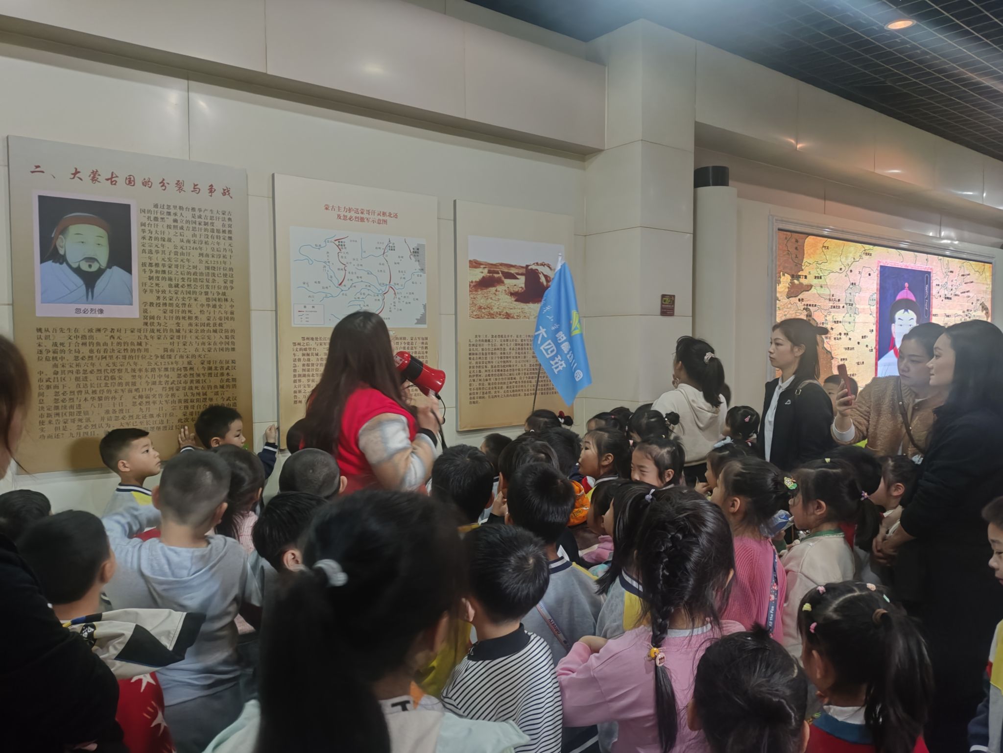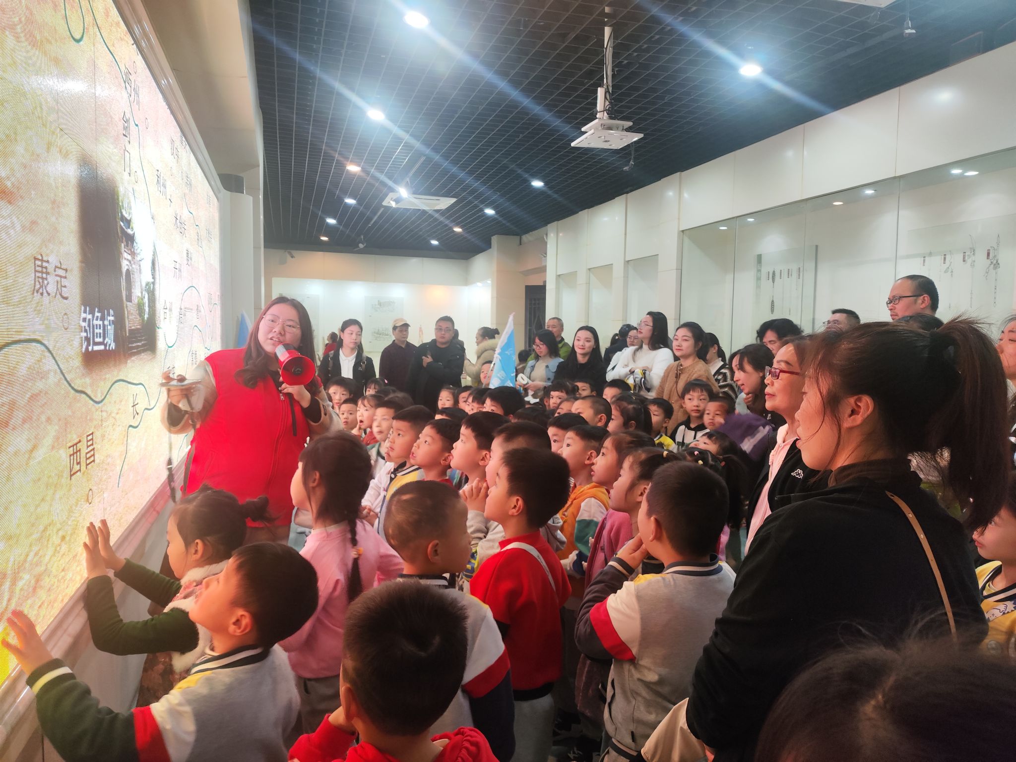 跟着四位同学的引导,来到了五个陈列厅进行参观,首先,进入了三号陈列厅,此馆主要是讲述了蒙哥汗之死的历史影响,里面陈列了许多的地形图、作战图和遗址照片,一踏入陈列馆“独钓中原”四个大字就彰显了该馆的主题,伴随着讲解员的介绍,小朋友们积极的提出了好几个疑问,“为什么钓鱼城易守难攻?”“成吉思汗的名字是从何而来?”等,张铃利同学都一一做了解答,同时小朋友们还参观了“钓鱼城军民情况”,“钓鱼城三十六年抗战部署”“钓鱼城城防的时代背景”这几个展馆,使他们对钓鱼城的具体情况有了初步的了解。