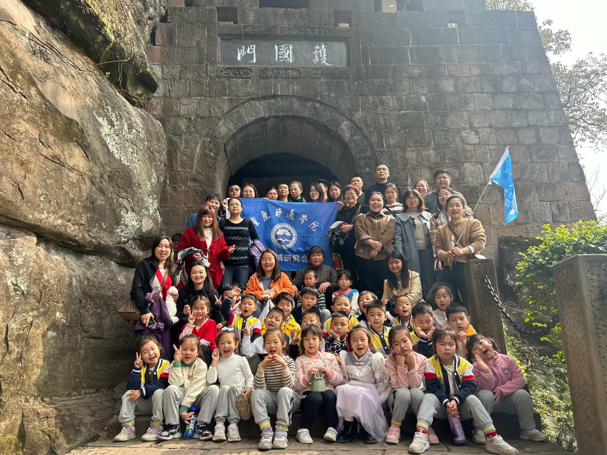 最后,小朋友们来到了本次活动的终点钓鱼城最大的八大城门之——护国门,在这里进行最后的合影留恋,通过本次活动,小朋友们对钓鱼城遗址有了深刻的了解和认识,从学习书本上的理论知识到眼见为实的感受古战场的魅力,进一步的激发了他们对学习历史知识的兴趣,相信钓鱼城精神已经深深的埋藏在他们心中。钓鱼城研究会的四位同学也表示,带团直接到钓鱼城遗址参观和在学校的钓鱼城历史文化博物馆参观还是有很大的区别,在这次活动中得到了更多的锻炼。