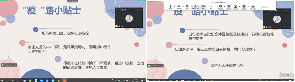 谭穗老师针对同学们即将返乡的这段时间,关心同学们的出行安全,给予疫情返乡小贴士:规范佩戴口罩,保护自身安全;准备充足的N95口罩、免洗手消毒剂、消毒湿巾等个人防护用品;尽量不在旅途中摘下口罩进食,若途中就餐,应错时错峰就餐,避免人员聚集等。