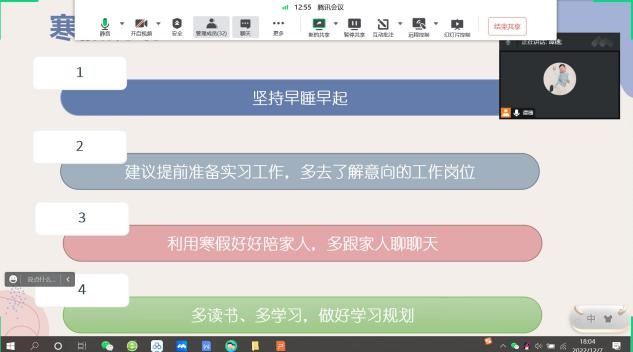 谭穗老师希望同学们在寒假期间能够做好规划,丰富自己的假期生活,例如:坚持早睡早起;建议提前准备实习工作,多去了解意向的工作岗位;利用寒假好好陪家人,多跟家人聊聊天;多读书、多学习,做好学习规划等。