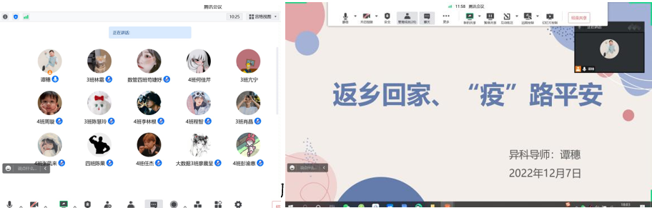 为了让同学们充分认识到疫情期间返乡的注意事项,认真规划接下来的假期生活。12月7日下午18:00,异科导师谭穗和2022级大数据管理与应用3-4班的35位同学齐聚云端,开展了以《返乡回家,“疫”路平安》为主题的活动。