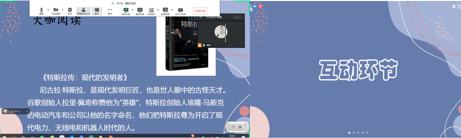 谭穗老师为了丰富和充实同学们的假期生活,推荐《特斯拉传》这本大咖阅读书籍,希望在下次活动能够听到同学们分享的读书感想,同时也希望同学们多读书、多好书,同学之间可以分享自己喜欢看的书籍。