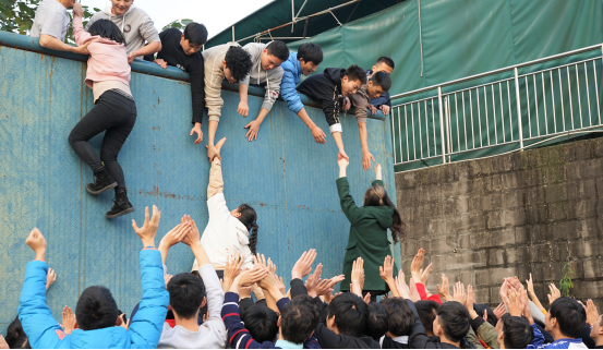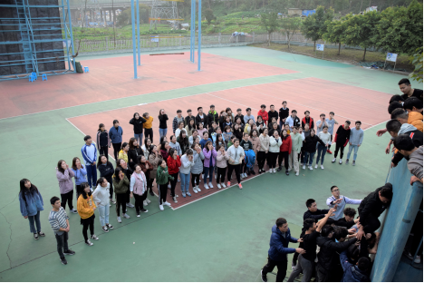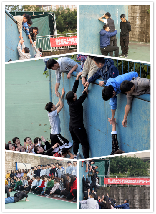 大家相互依偎站在“逃生墙”下,踩着“人梯”向上攀爬,其余同学并用手形成保护层保护攀登的同学。看似近在咫尺的距离去需要用尽数人的努力才能完成。攀爬之中,体现出的是大家对于集体的荣誉感,是对彼此的信任感,是对于挑战的无畏感。