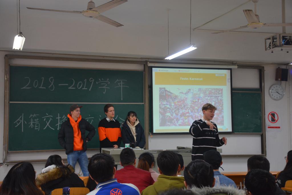 交换生们还讲到了德国的日常饮食以及一些著名节日,一张张看起来很可口的德国美食照片让同学们非常心动,在德国除了好吃的香肠土豆,还有很多来自其他国家的异域美食,比如很受德国人喜欢的土耳其烤肉Döner,以及意大利面,希腊菜等。德国的节日也是很丰富多彩,比如很受年轻人欢迎的狂欢节,也有温馨传统的圣诞节,交换生David还介绍到他家乡的独特节日,人们都会穿着统一的制服在街上游行,场面十分壮观。