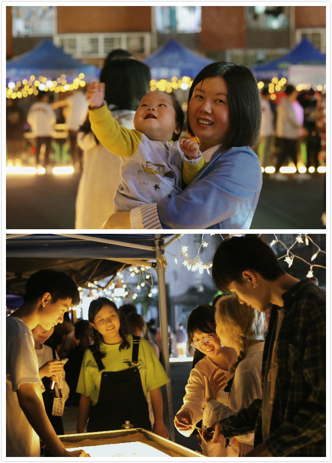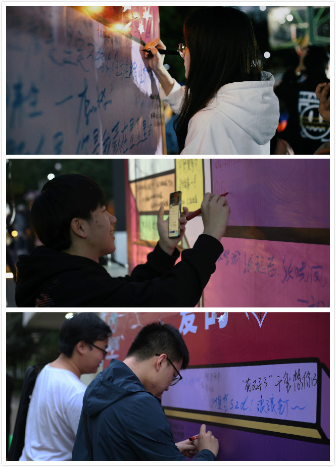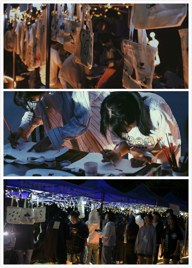 当白衣白包遇上颜料,又是怎样一副画面。“肆意”的绘画书写,寄托了同学们的创意和灵感,大家在绘制的卡通上重拾儿时的快乐。星星点点的灯串中挂满了“作品”,人群驻足观赏中不乏赞叹和跃跃欲试,转眼,“TA”已经坐下开始了自己的绘图“工作”。