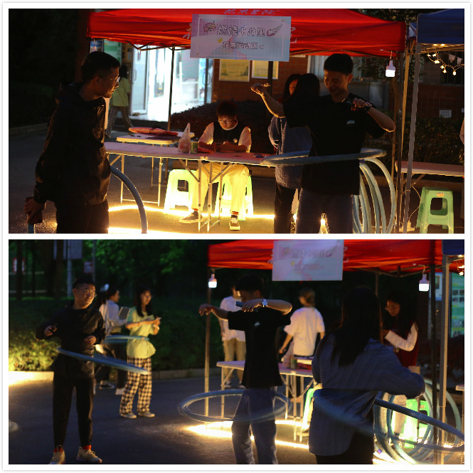 四月,花肆意地开,少男少女迎风肆意奔跑。所谓“生命不息,运动不止”,少男少女与夏天的较量也将在四月开启。花果夜市响应“全民运动”的号召,致力于提高同学们的体质,在运动中交友,贯彻书院“社区共享”理念为大家提供了肆意燃烧卡路里的运动区域。当呼啦圈转起,一圈一圈旋转的不仅健康,更是大家洋溢的快乐。而踢毽子也很热门,不仅有单人组,还有几个女生当场组队玩起了踢毽传递,毽子在空中飞翔,踢起了青春,也踢起了童年。“我想起来自己上一次玩这个都是小学了,那个时候会踢毽子的就是孩子王啊!以至于现在看到这个‘古董’就想起自己曾经的刻苦练习,虽然早就回不去那个时候了,但是我还可以在这里和这些小姐姐们组队啊。”一位女生这样说。花果书院也正是以这样的方式让大家在夜市中感触并找到自己的志同道合。