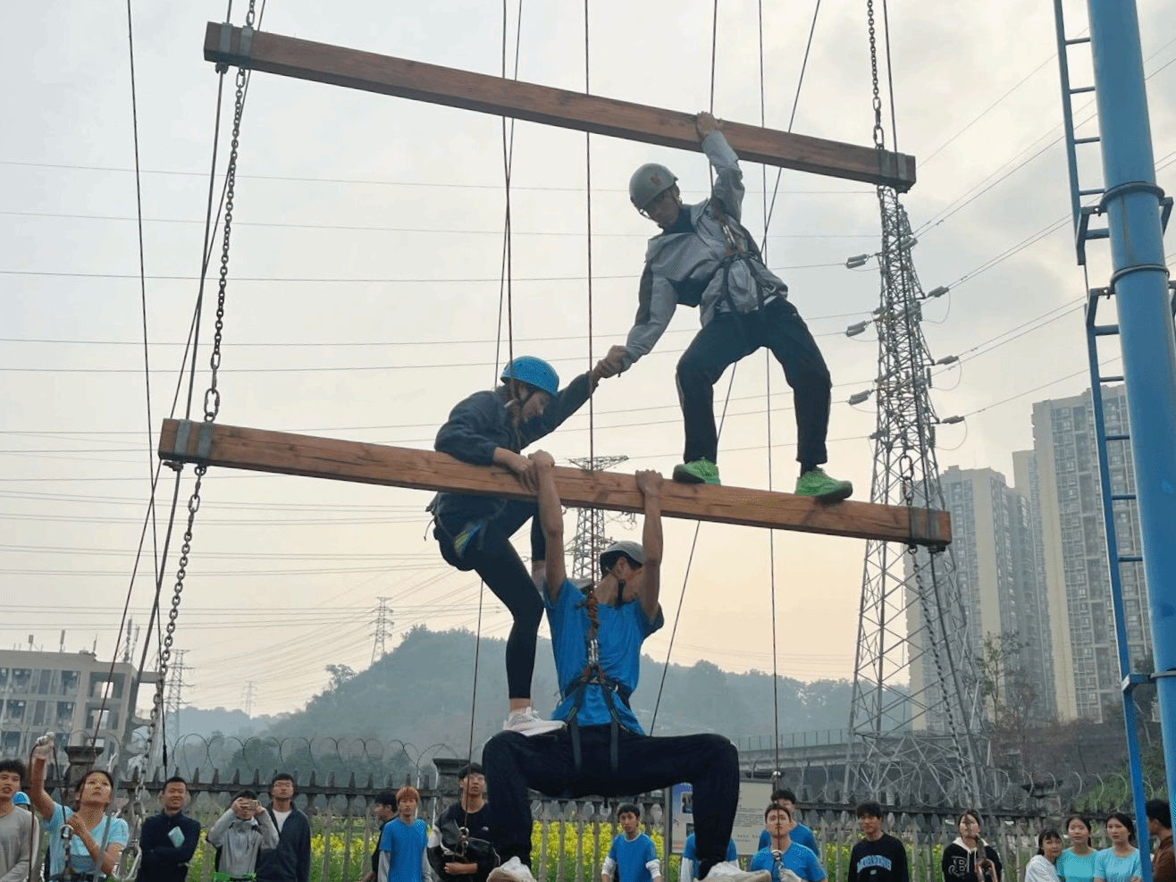 交流会结束后,合川校区户外运动队的教练们带领綦江校区的师生们参观了合川区校园,并在高空基地进行了户外攀岩、勇攀天梯、断桥、定向等户外拓展项目交流体验。