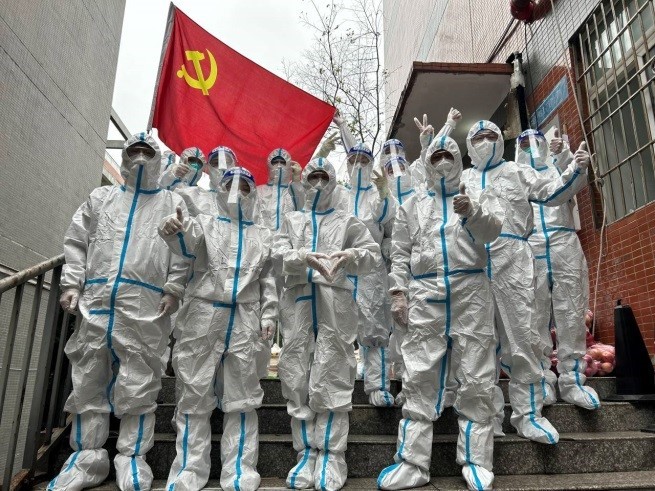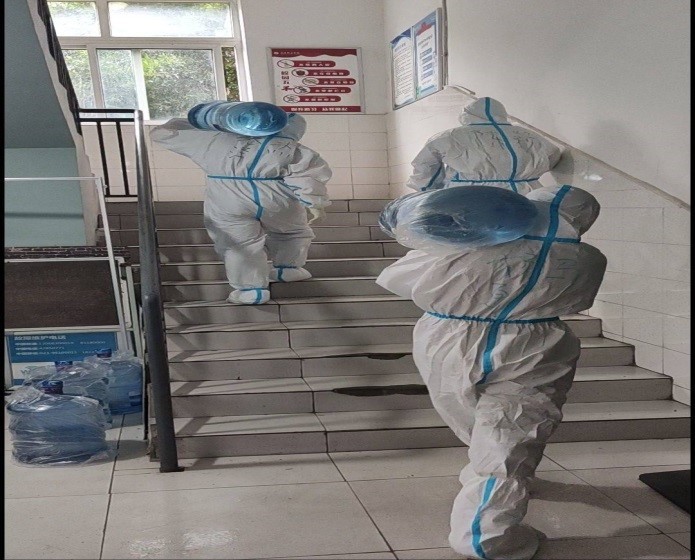 异科导师王军给同学们分享了这次抗疫过程中众多经历中的一次:任务是将79桶桶装水和250提盒饭,从下车点搬运到廊桥书院B1四楼,先搬水,后搬饭;由于防护得太严实,使得呼吸变得非常困难,男老师每人扛着一桶水,每爬几步楼梯就不得不停下来踹几口粗气,女老师没有力气扛一桶,就俩位老师抱一桶,尽管呼吸困难,汗水湿透了全身,但是,没有一位老师叫苦喊累,大家默默地坚持着,扛不动了就停下来休息一会,然后接着扛,你搬不动了我主动来帮忙,年纪大的老师扛不动了年纪轻的老师主动来帮助,女老师抱不动了,男老师就主动上去帮忙,就这样一桶一桶,一层一层,一个台阶一个台阶,大家相互鼓励,相互帮助,团结一心,克服各种困难,终于按时完成了搬运任务,保证了每一位被隔离的同学有饭吃,有水喝。
