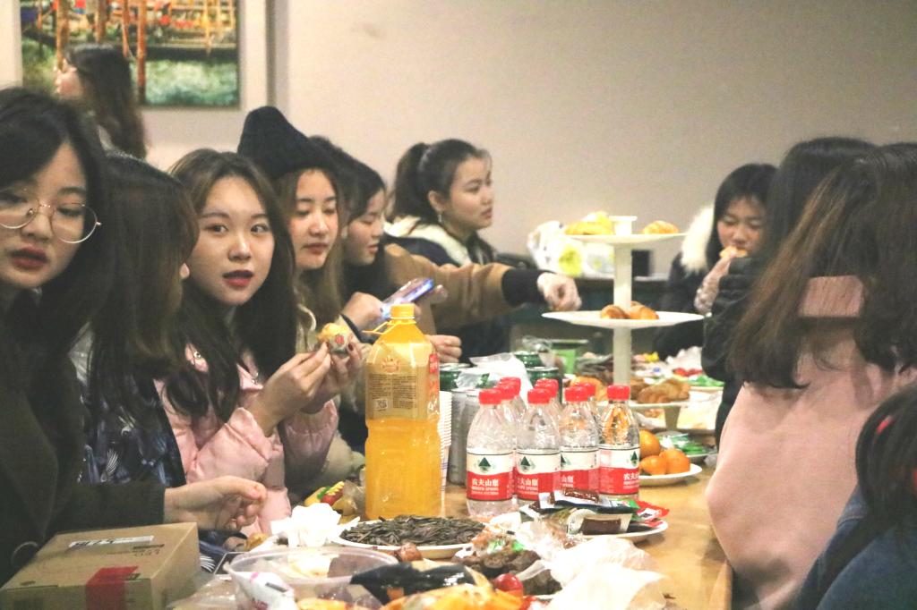 酒会自由交流环节,美味佳肴勾人胃,香醇甜酒沁人鼻。席间,唐老师与同学们并肩而座,交谈融洽。记者团大一干事陈桃英说:“我觉得部门举办交流酒会还是挺好的,大家坐在一起,增加了交流的时间,让我们消除陌生感,使得彼此的关系更加融洽。还有就是,中国自古就有酒桌文化,在餐桌上交流,大家会更轻松,更能感受到归属感。”同学们享用着自己亲手准备的食物,心情十分放松,从学习、生活出发,分享校园新闻宣传工作经验和自己的点滴感悟,相互学习,积攒经验,共同进步!