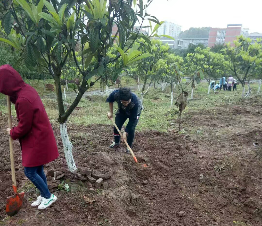 (图为谭秋涛带领院系学生在外国语言文学系自留地“sophia”里为果树松土施肥)