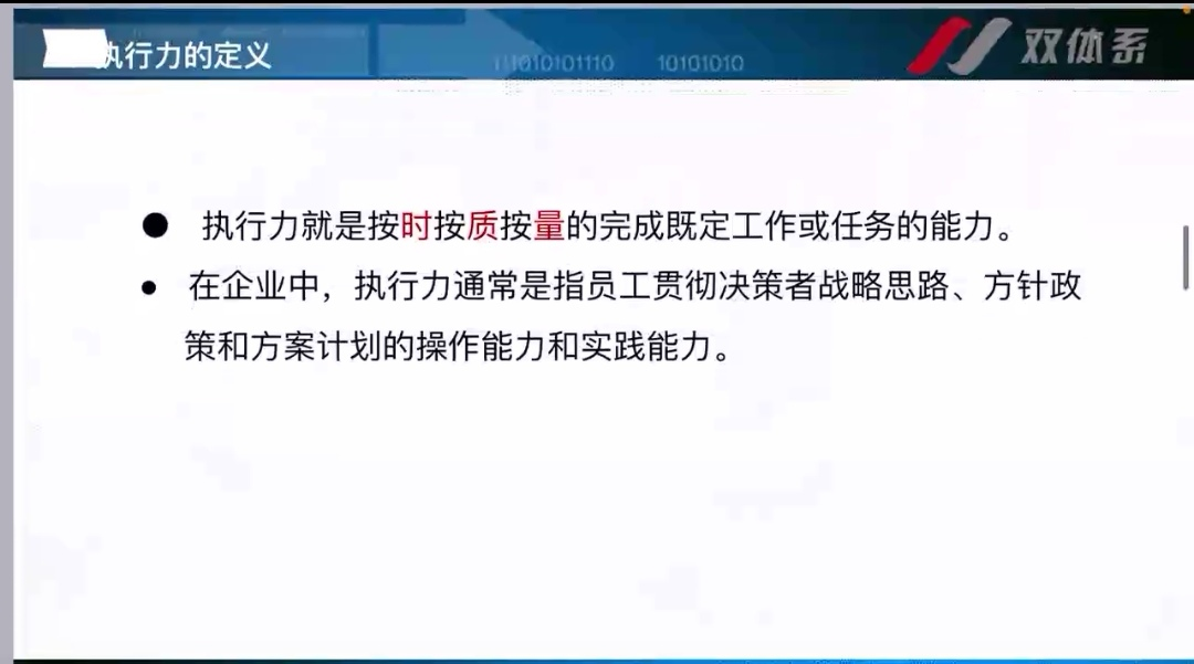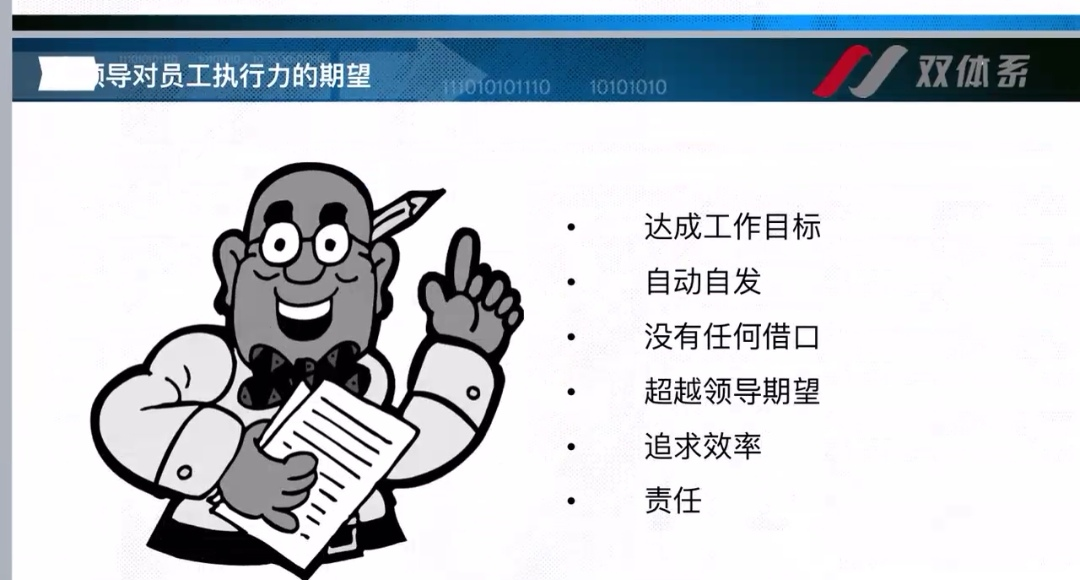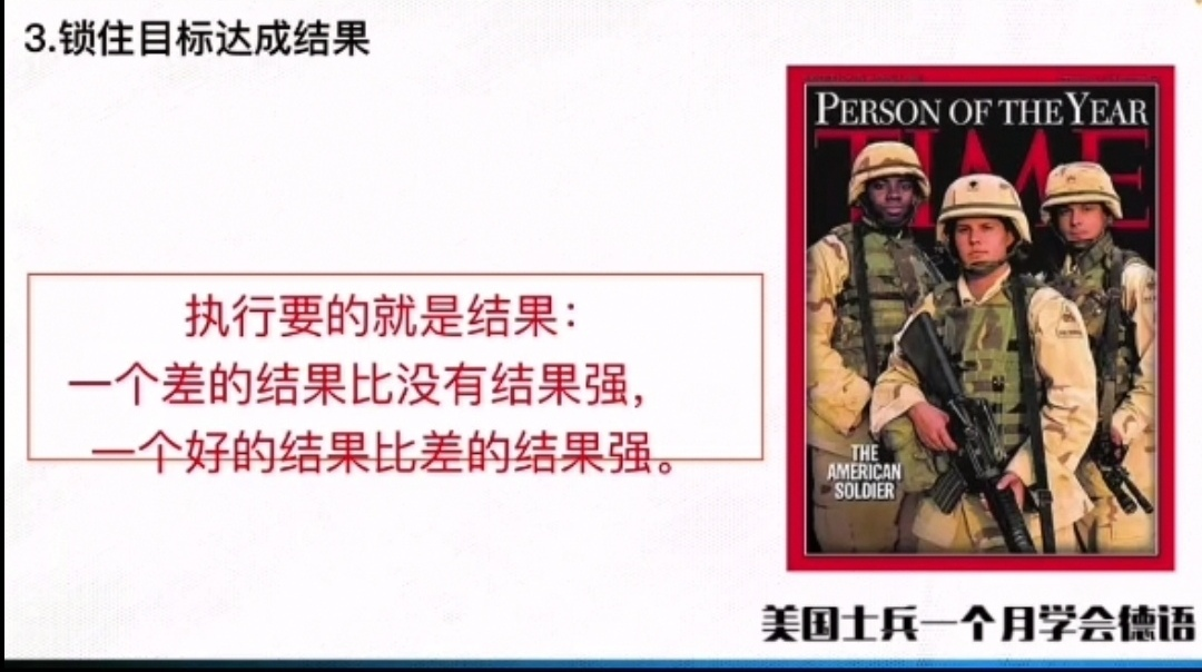 在为何需要执行中,刘佳老师又从执行力是个人走向成功的必要条件、执行力是实现目标的必要条件、以及领导对员工执行力的期望三个方面讲述了执行的重要性。没有执行力,一切梦想、设想、理想,都只能是幻想。而执行力是拉开人与人之间差距的关键所在。