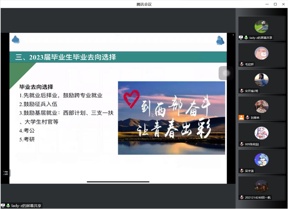 最后,周老师提供了一些毕业去向的选择,展示出“三支一教”、“征兵”以及“西部计划”的报名网址,具体地讲述了国家性职业的具体要求、时间等,为同学们在当前的就业形势下选择哪些职位有了清晰的认知。