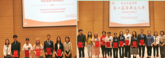 少年强则国强,青年永担时代责任,做到安而不忘危,则家国可保矣,中华未来之路可长远矣。一张海报,小小天地,短短六分钟展示时间,我们却可以探知当代青年所蕴含的无穷力量。比赛最后,各评委老师为本次国安达人秀获奖选手颁发证书并合影留念。本次比赛共颁发一等奖一名,二等奖二名,三等奖五名,其中外国语学院张晓田荣获一等奖,淬炼·国际商学院简春芳、大数据与计算机科学学院刘静荣获二等奖,数字经济与信息管理学院尹凤婷、艺术传媒学院钟汶燕、大数据与计算机科学学院李苛夏、德国工程学院周文发、外国语学院李雪青荣获三等奖;并评选外国语学院杨茂林老师、淬炼·国际商学院张竞艺老师、大数据与计算机科学学院徐瑞成老师为优秀指导老师。最终,通过计算海报数占学院总人数的比例,评选出数字经济与信息管理学院和外国语学院为优秀组织单位。