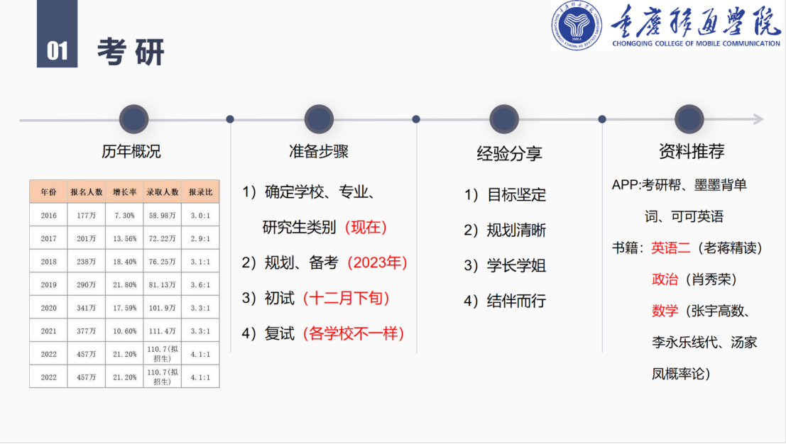 本次交流会分为三个板块:考研、考公和考编。在考研板块,杨老师首先简要介绍了历年的报名人数、录取人数、报录比和准备步骤,让同学们正确认识考研形势;然后杨老师结合自身的考研经历,分享了备考的经验;最后杨老师给准备考研的同学们推荐了一些学习软件和书籍,全方位助力大家备考。