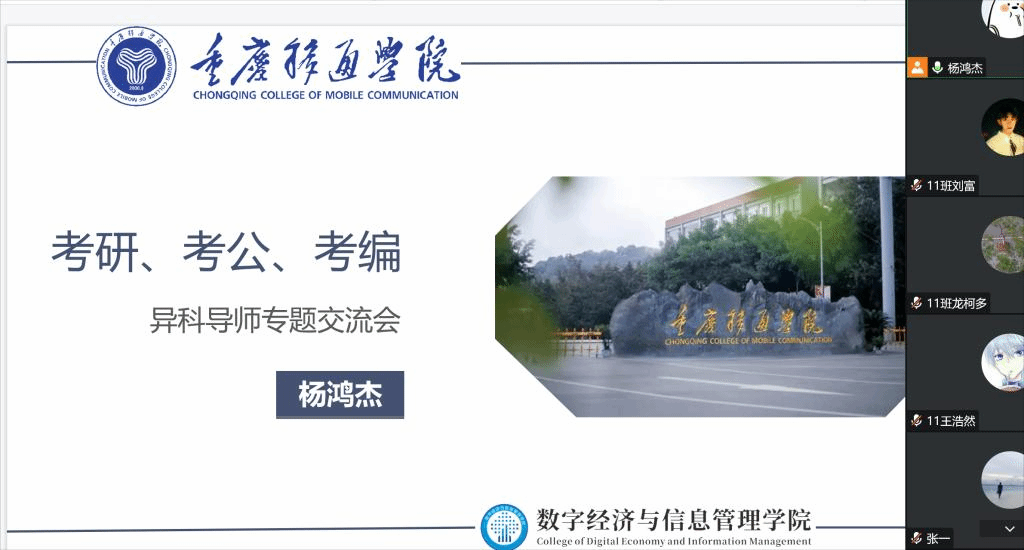 基于当前严峻的就业形势,为帮助异科学生明确未来发展方向、形成正确的择业观、实现高质量就业、提升考研考公考编热情,同时将就业服务和指导落到实处,12月14日下午,异科导师杨鸿杰邀请数字经济与信息管理学院2022级大数据管理与应用专升本11、12班的学生参加了考研、考公、考编专题线上交流会,共有20余名异科学生参与了本次交流活动。