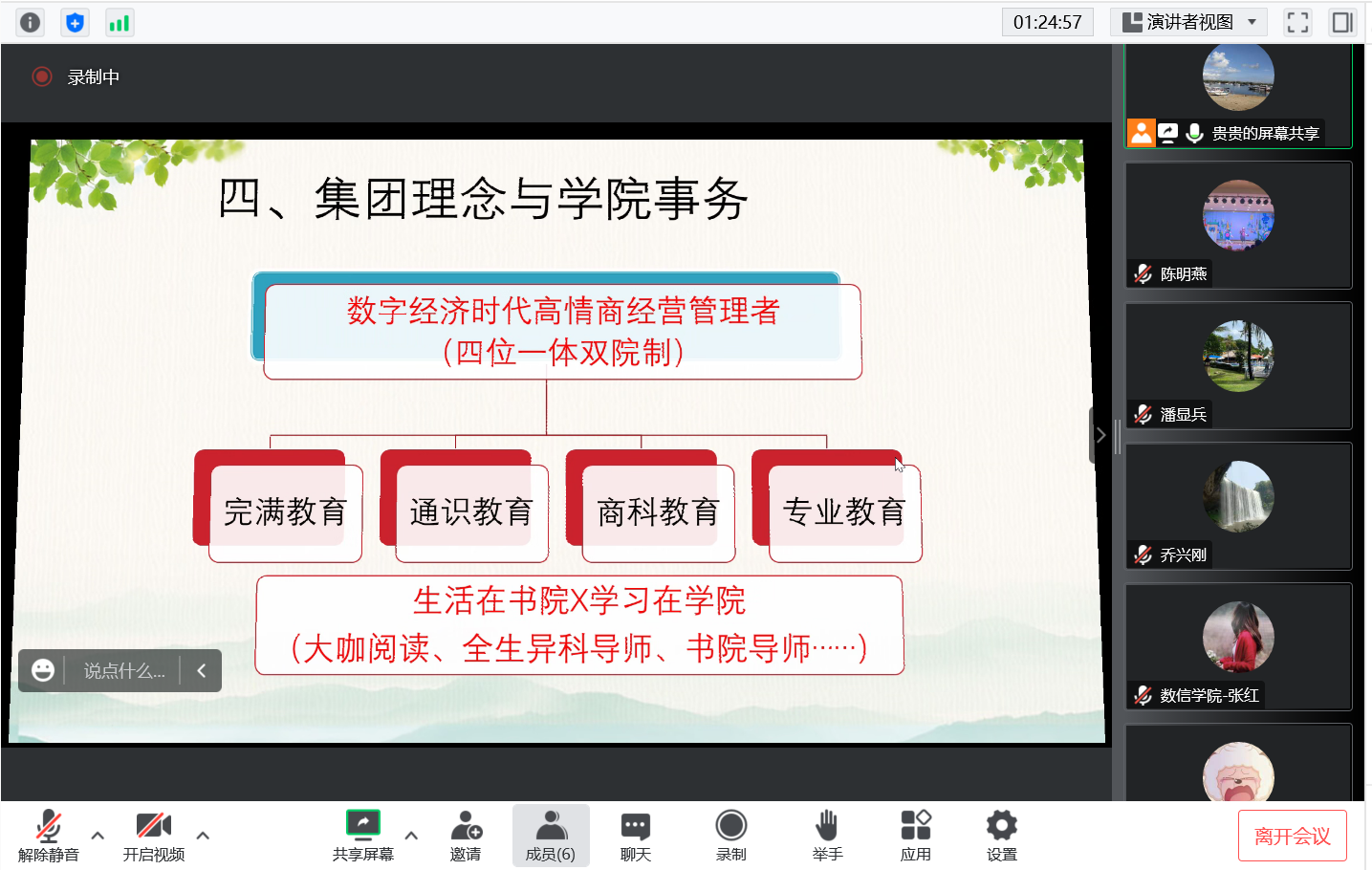 学习过程中,刘院长从教学方面开始逐步深化,延伸到集团对数字经济时代中小企业高情商经营管理者人才培养的育人工作上。作为专业教育的教师,能够做什么?应该做什么?启迪老师们要在四位一体双院制育人理念的践行上多下功夫。