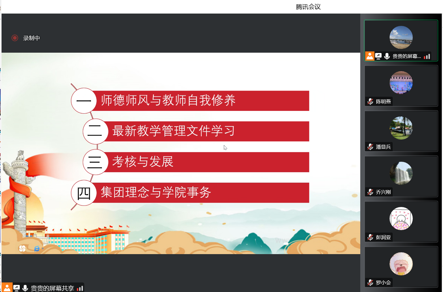 培训开始,主讲人刘贵容教授从师德师风与教师自我修养、最新教学管理文件学习、考核与发展、集团理念与学院事务四个方面进行培训。刘老师谈到,“立德树人”要求必须坚持德育为先;“立德树人”要求必须着眼促进学生全面发展;“立德树人”要求必须坚持培育学生健全人格;“立德树人”要求必须致力于“让每个孩子都能成为有用之才”的教育理想,老师要以学生为本,一切为了学生,为了学生的一切,依法执教,爱岗敬业,热爱学⽣,严谨治学,团结协作,廉洁从教,为⼈师表,做新时代的“四有”好老师。