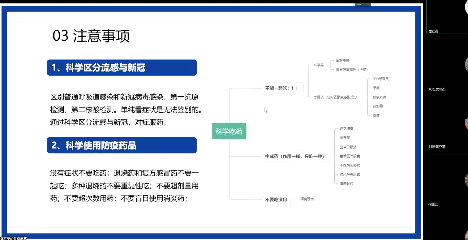 除此之外,谭老师还讲解了普通流感与新冠感染的区别,提醒同学们如果出现不舒服的症状,一定要先分辨清楚是普通流感还是新冠感染,尽量对症用药、科学用药。