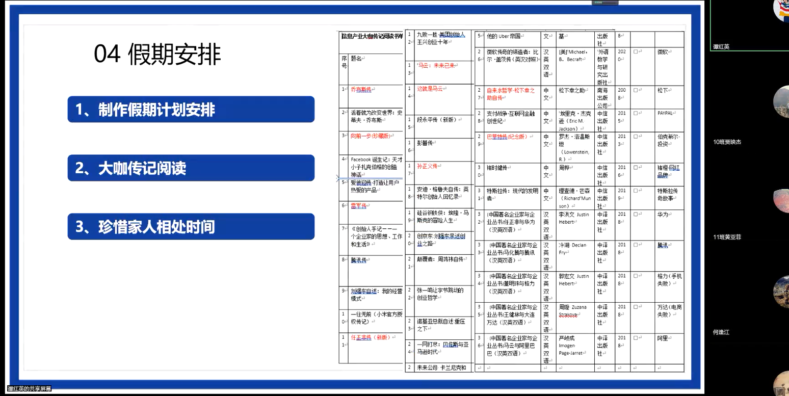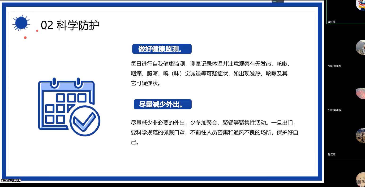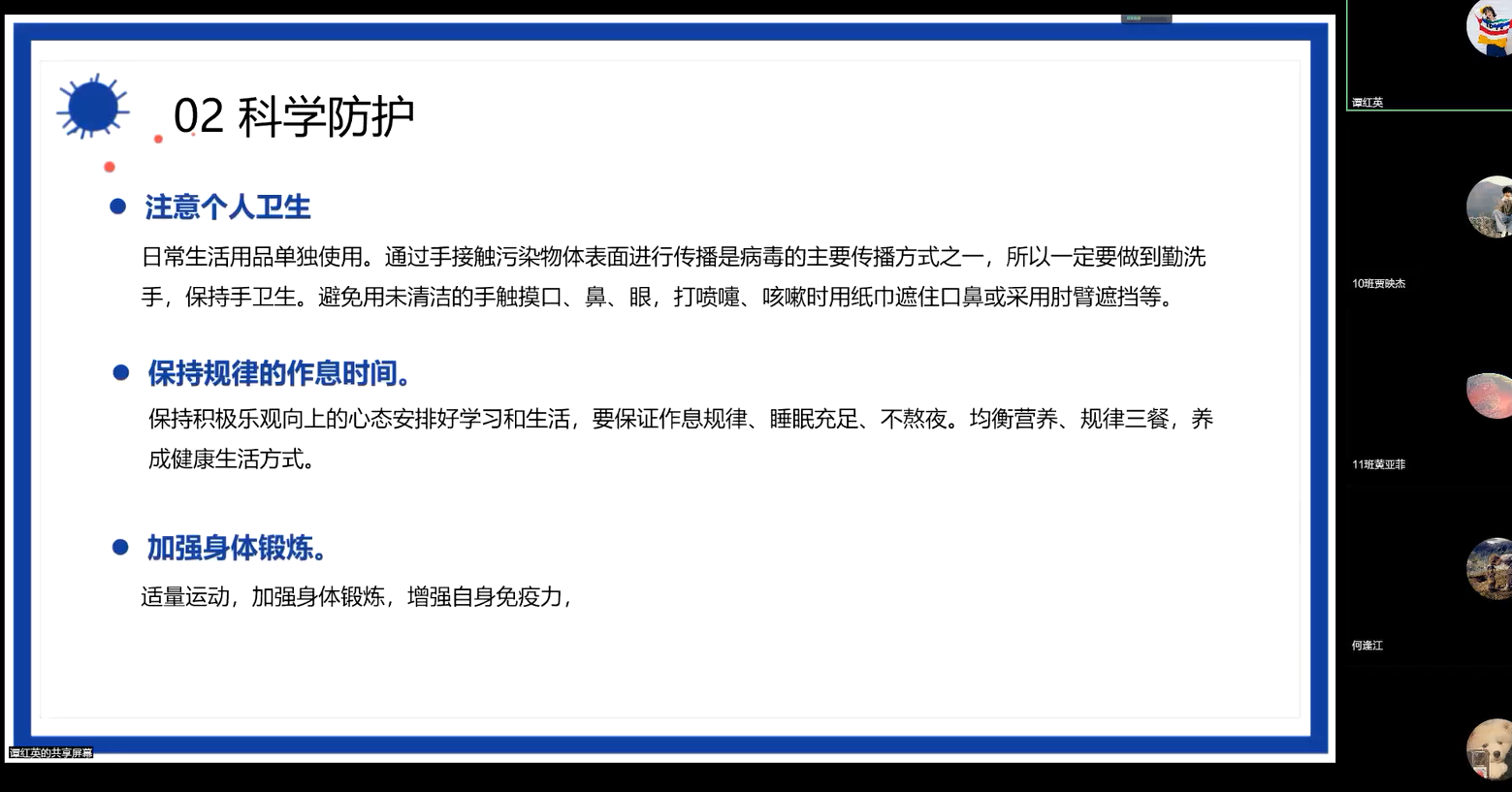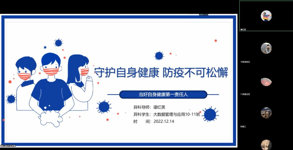 目前,同学们都陆续安全到家,但各地疫情风险仍然存在,为加强同学们做好自身健康第一责任人的意识,12月14日下午15点,异科导师谭红英与2022级大数据管理与应用10-11班的35位同学齐聚腾讯会议云端,开展了《守护自身健康 防疫不可松懈》为主题的活动。
