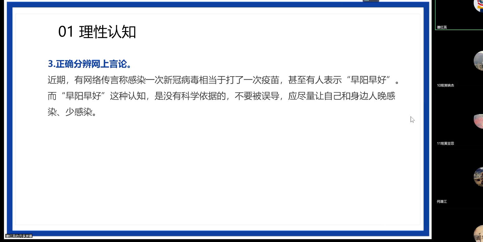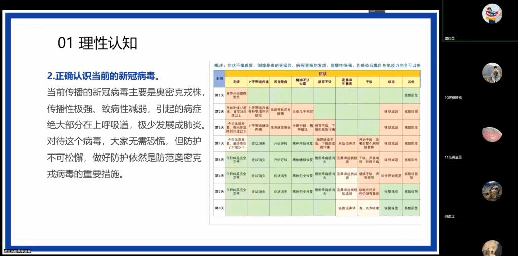 我认为这次新冠主题会议很有必要,现在我们身边新冠感染人数过多,且日益增长。英姐为我们想得很细致,不仅为我们讲解了怎么预防新冠、怎么保护自己,也科普了就算不幸变“阳”,我们应该怎么做。在最后,还提醒我们应该有计划有行动,让我们这漫长的假期里变得有价值、有意义。