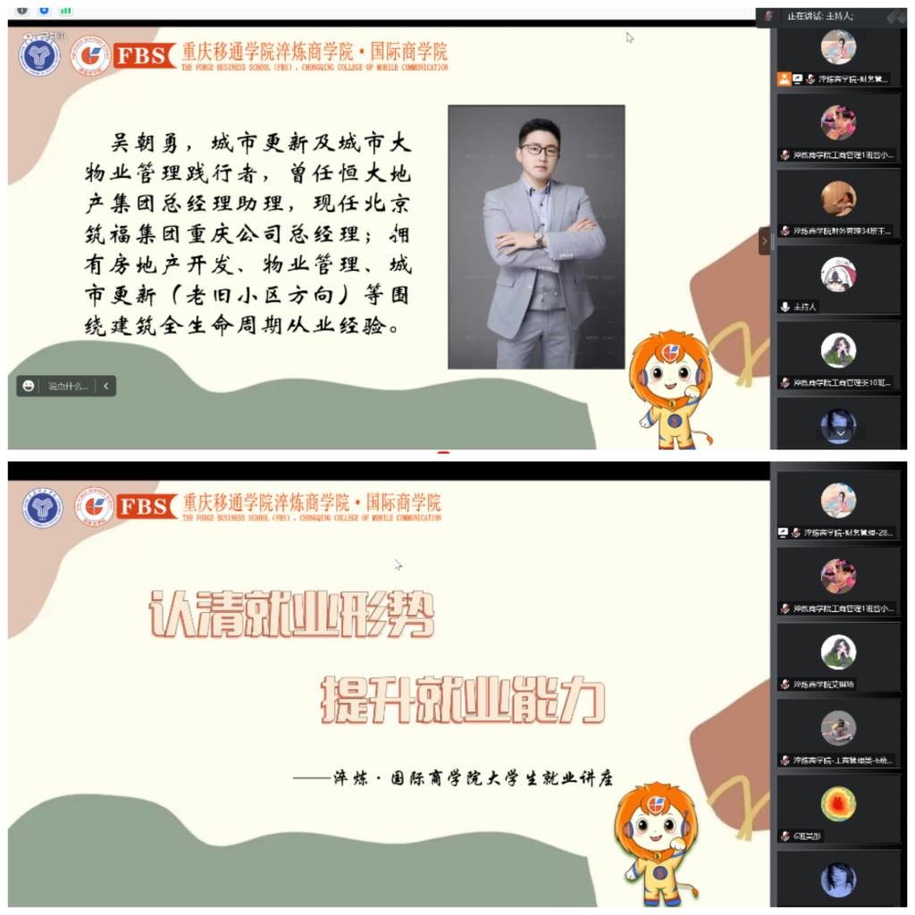 为引导同学们进一步认清当前就业形势,转变就业观念,不断提升同学们积极就业的意识,提前做好就业准备。由就业创业指导与服务中心主办、淬炼·国际商学院就承办的认清就业形势·提升就业能力——淬炼·国际商学院大学生就业讲座于2022年12月14日15:00在腾讯会议举行。本次讲座是来自北京筑福集团重庆公司总经理,拥有房地产开发、物业管理、城市更新等丰富从业经验的吴朝勇老师为同学们进行相关就业指导。