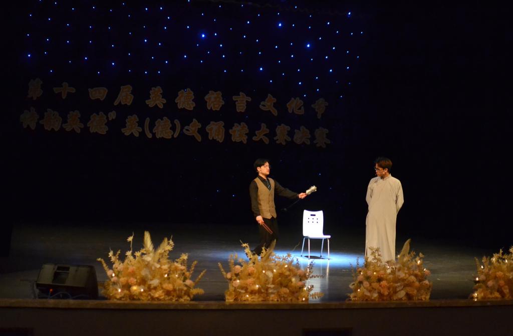 精彩的表演已经告一段落,外国语学院外教Marvin对今天的表演做出了点评。他讲到这次的诵读比赛让人眼前一亮,这场比赛让大家感受到语言的魅力,提到这场比赛离不开每一位幕后人员的辛勤付出,最后祝愿英德语言文化节能在大家的努力下办得越来越好!