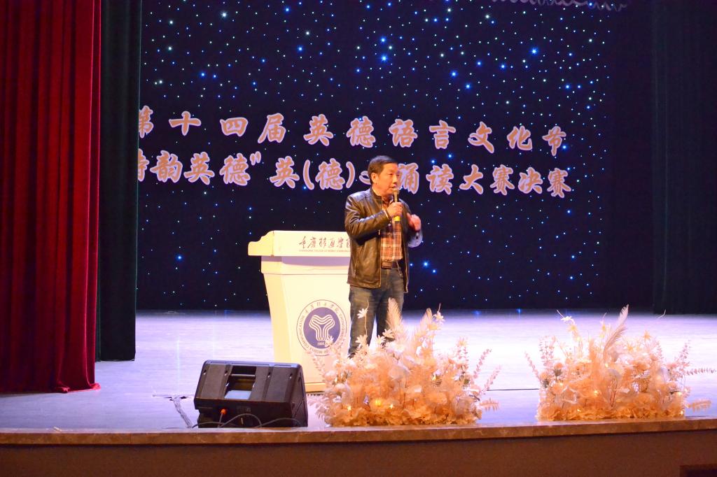 外国语学院院长吴世银上台致辞,期望所有的参赛选手能够用最好的状态来面对此次的决赛舞台,角逐第十四届英德语言文化节之“诗韵英德”英(德)文诵读大赛决赛的冠军,为大家带来一场精彩绝伦的视听盛宴!