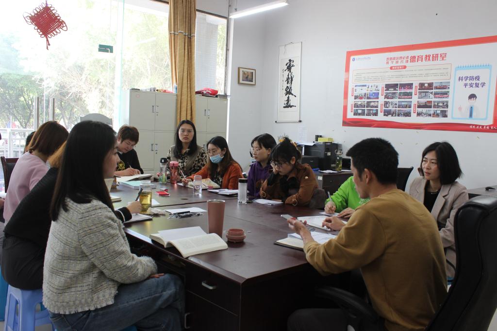 为积极响应学校教育思想大讨论工作,思政教学部专门组织全体教师学习文件,认真领会,积极推进教育思想大讨论工作实施。在部门推进会的基础上,4月20日下午16时,德育教研室召开教育思想大讨论工作部署会,进一步安排部署了具体工作,细化到每一个人,从而保证各项工作真正落实并取得实效。会议由德育教研室主任杨勇主持,德育教研室全体教师参加。