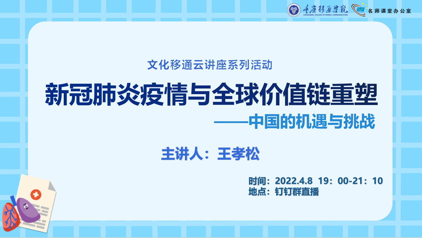 4月14日晚7点,文化移通开设线上研讨课,带来了中国人民大学经济学院教授王孝松老师的《新冠肺炎疫情与全球价值链重塑——中国的机遇与挑战》,为我们讲解了新冠疫情全球价值链重塑背景下中国的机遇。