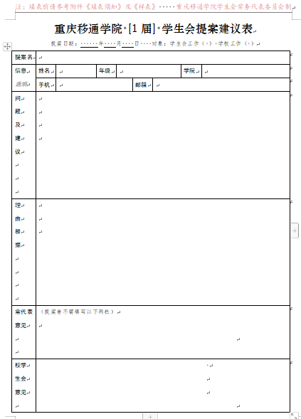 因此,学生会开通了针对非常规问题的【提案建议】的渠道,同学们可以点击阅读原文下载提案建议表(样表如图2),填写遇到的问题和自己的想法。并提交给校学生会权益部门负责人,工作人员将定期进行汇总、整理、分析并与职能部门共同解决。