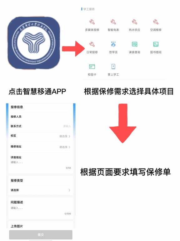 重庆移通学院为同学们提供了线上报修窗口,同学们可以在智慧移通APP上找到对应栏目,并根据您所需要报修的项目,进入对应的窗口,并按照网站要求填写联系方式、详细地址、报修内容,您还可以提交图片,以便于使后勤部门更快速准确地识别问题。在报修单提交后,您还可以查看报修单处理进度。