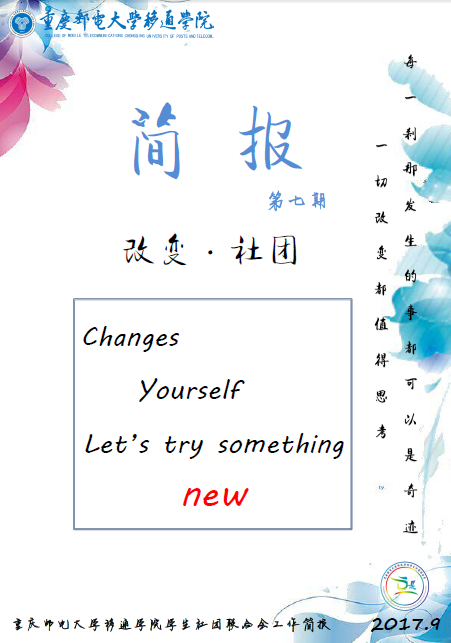 九月,世界在改变,我们在脱变。稚嫩的九月,改变随处可见,蜕变从未停歇。军训的艰辛、社团的纳新、社团上一学年表彰大会的圆满成功、社团破冰的欢乐,构成了一幅幅青春的模样。电影沙龙的精彩、移通铁人的佳绩、远景农场的变化,无一不绽放出蜕变的光芒。