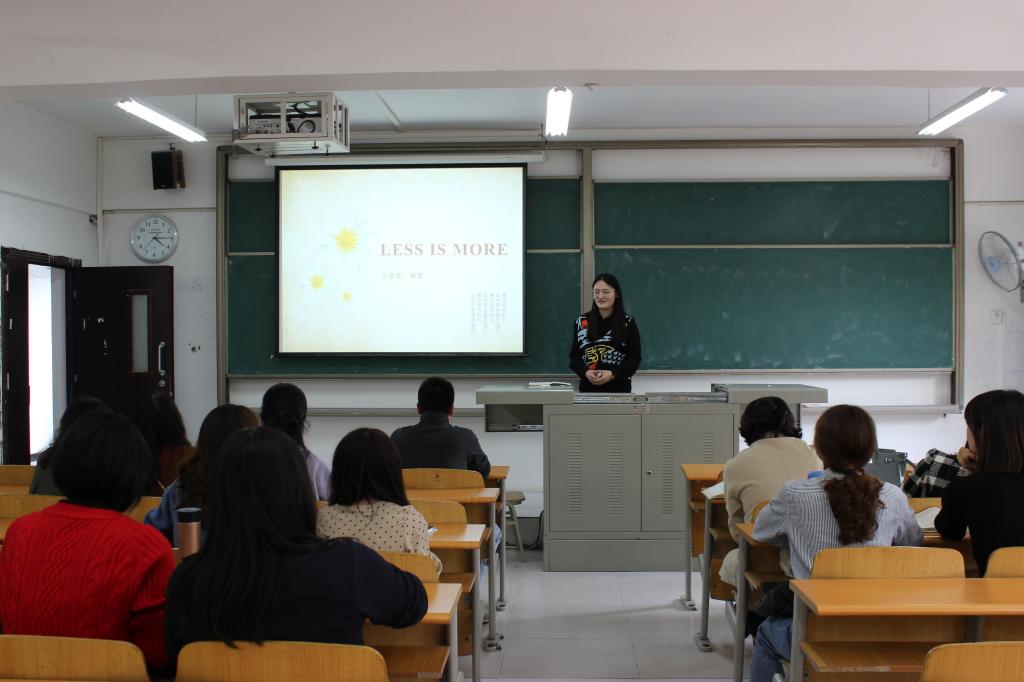 鄢老师首先向大家介绍了她喜爱的书籍——《瓦尔登湖》,本书的作者是亨利.戴维.梭罗,著有《论公民的不服从义务》《没有规则的生活》《缅因森林》等论著。随后,鄢老师从内容简介、书评、阅读感悟等方面向诸位老师进行扼要的分享,重点介绍了书中《我生活的地方,我生活的目的》《阅读》《孤独》等文章片段,揭示了作者在回归自然生活实验中所发现的人生真谛——如果个人能满足于基本的生活所需,便可以更加从容、充实的享受人生,这的确是一本清新、健康、引人向上的书籍。