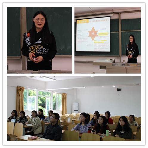 荷花池畔风光好,芭蕉树下气候凉,移通四月闲人少,勤学乐读喜洋洋。在这美好的谷雨时节,为鼓励思政教学部全体教师读经典、悟原理、在阅读中夯实理论功底、提升精神境界,4月21日下午4点,思政教学部全体教师在1310教室举行本学期第一次经典研读分享交流会,本次会议由鄢星老师主讲。