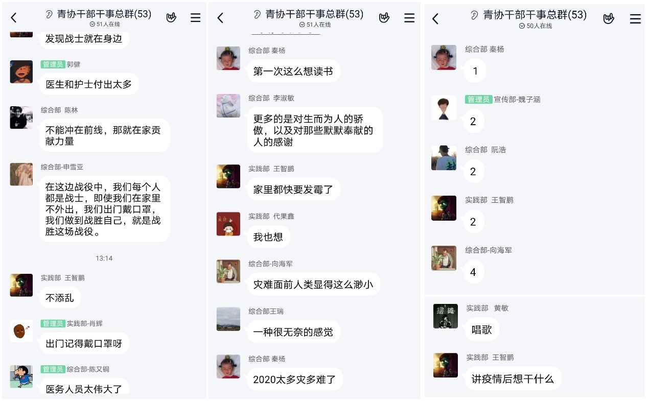 抗疫不是并非一朝一夕或凭谁一己之力就能完成,疫情面前生命十分渺小,每一个人都应尽自己的力量参与全民抗疫。虽然疫情在人与人之间形成一道无法接触的屏障,但大家也要乐观向上,相信明天依旧有无休止的阳光和数不尽的生机。学生组织内部交流于国内学生来说尚有欠缺,希望通过此次线上交流活动能增强同学们之间的情感交流,将未来的志愿工作做得更加出色。