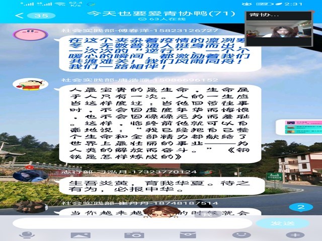 为了增进学生组织内部各部门的交流与感情,进一步打好学生工作基础,2020年4月2日,智能工程学院青年志愿者协会组织一次以“线上相聚,云端交流”为主题的内部交流活动。向疫情中奋战在一线的最美逆行者们致敬,而每一个同胞都应该积极响应祖国的号召,自觉与国家命运相连接。