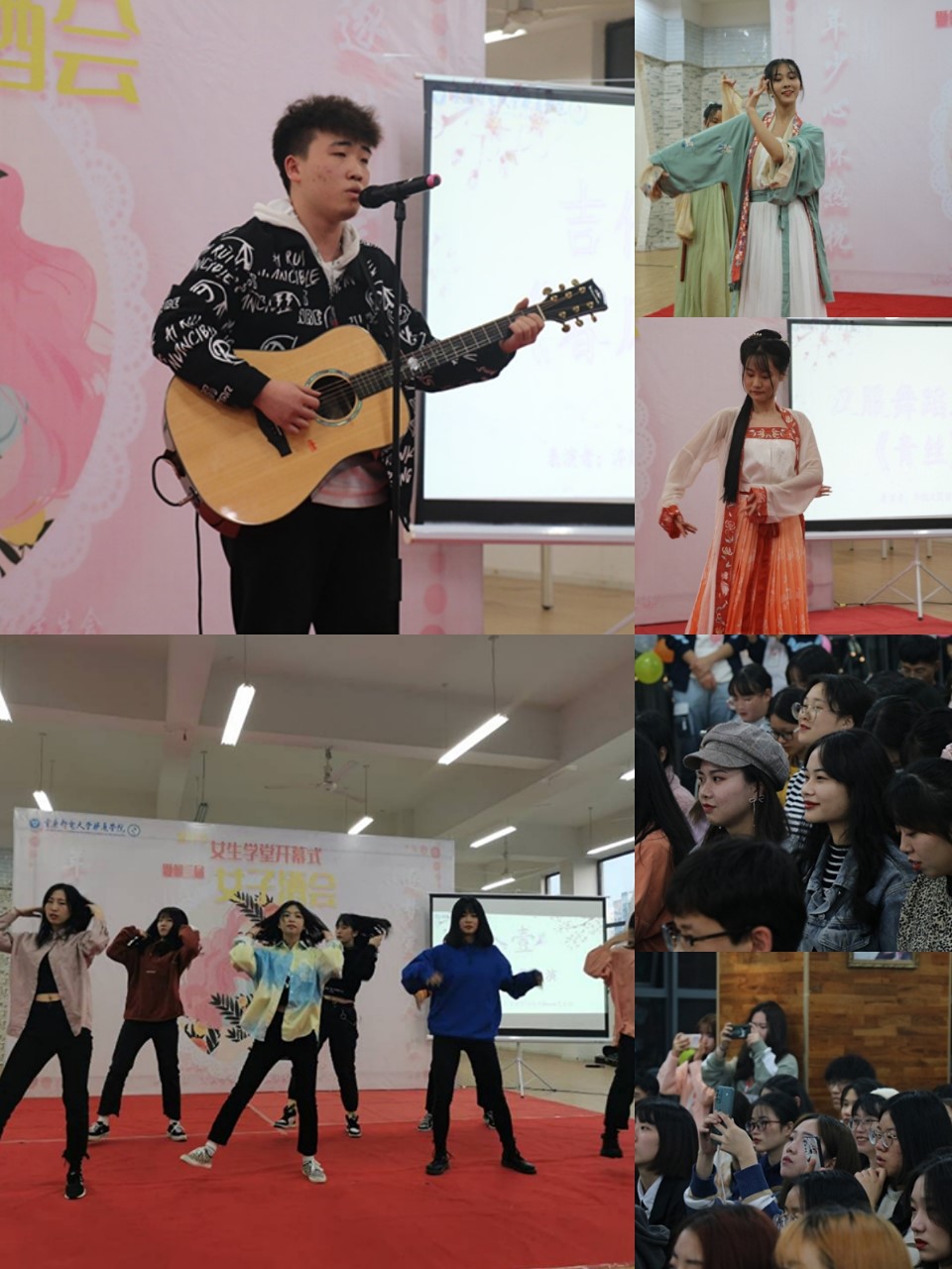 “春水初生,春林初盛,春风十里,不如你”随着主持人的话语落下,由Venus艺术团歌手带来的弹唱表演《春风十里》,现场氛围再一次被点燃;“舞低杨柳搂心月,歌尽桃花扇底风”,在春风过后又是桃花盛开,华韵汉服协会为大家带来的舞蹈表演《青丝》,展现了女生的别样风华,有着不同于《春风十里》的柔美,展现出女生自信美丽大方的一面;古今穿梭,大学生艺术团的舞蹈表演,把活动氛围推向高潮。