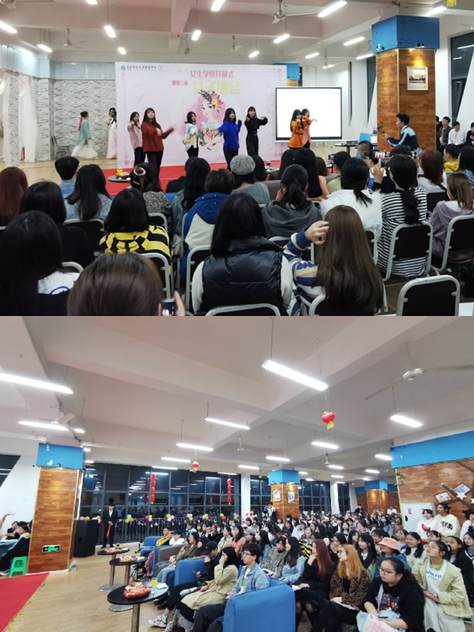 舞闭,主持人用“花香木兰心惠智,扫眉才子笔玲珑”“唯愿当歌醉酒时,月光长照金樽里”进行着富有诗意的开场,在其身后的大屏幕里播放着往届女生学堂的风采风貌,为同学们展示往届的精彩瞬间,随后上届女生学堂的“女神”代表上台为大家分享在女生学堂的经历与收获,鼓励学妹们积极参与,投入女生学堂这个大家庭,锻炼更好的自己,成就更好的自己。