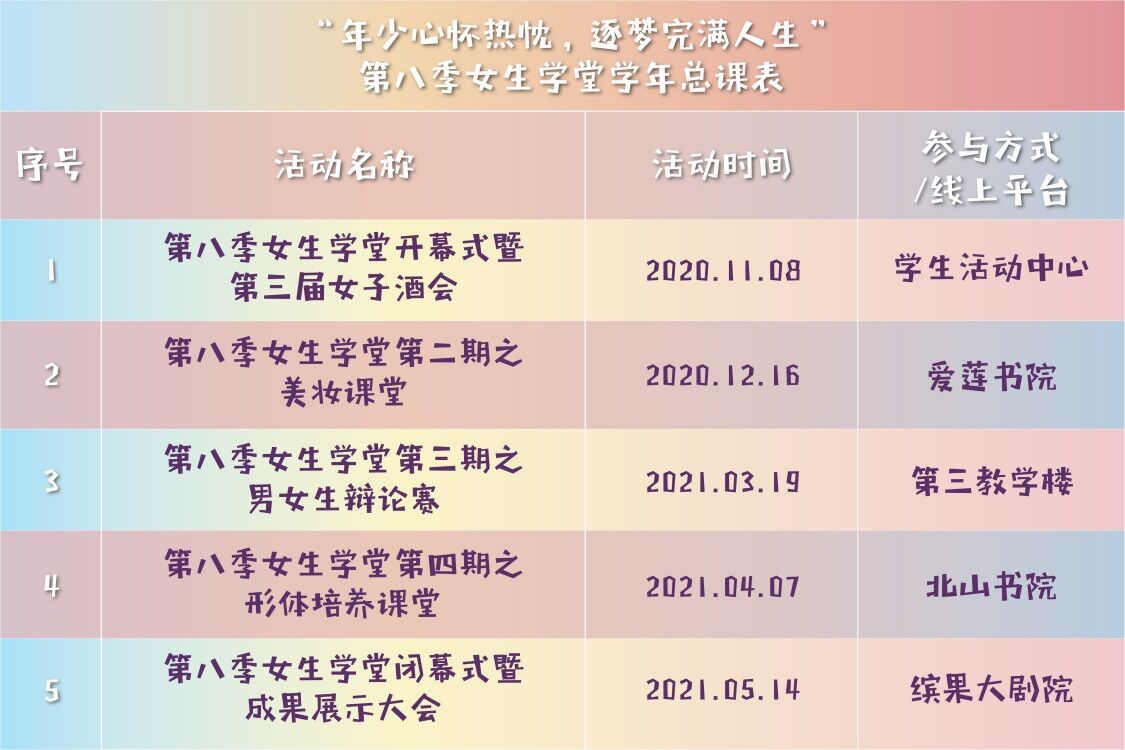 第八季女生学堂总课表已附上,涉及言语、内涵、形象,从多角度、多方面达到培养我校女生“敢说”的最终目标。这一季我们将带给你全新的体验,继续携手绽放青春。