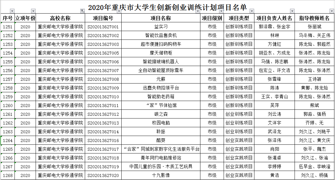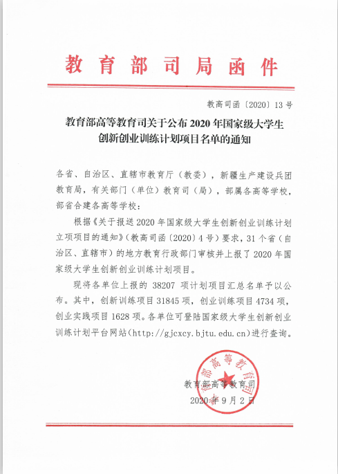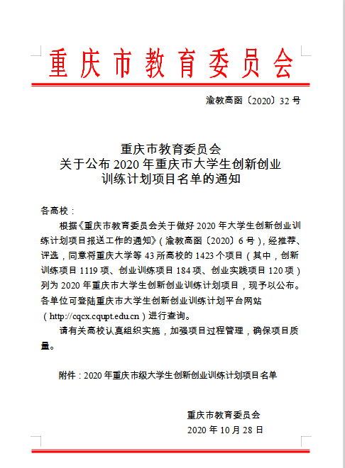 近期,接到教育部高等教育司《教育部高等教育司关于公布2020年国家级大学生创新创业训练计划项目名单的通知》(教高司函〔2020〕13号)和重庆市教委《重庆市教育委员会关于公布2020年重庆市大学生创新创业训练计划项目名单的通知》(渝教高函〔2020〕32号)文件,我校20个项目获准立项,其中国家级2项、重庆市级18项。